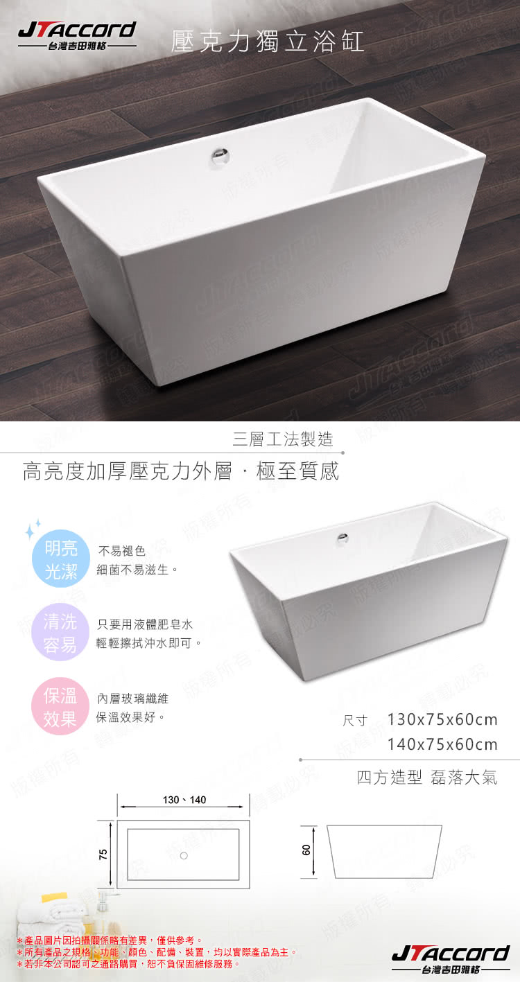 用google找到了ptt評論品牌介紹文介紹 JTAccord 台灣吉田 01333-130 長方形壓克力獨立浴缸(空缸)規格↓
