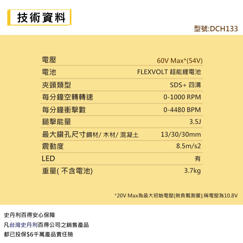 【DEWALT 得偉】60V MAX* 54V無碳刷四溝三用可換頭電鎚鑽(DCH333)簡介說明