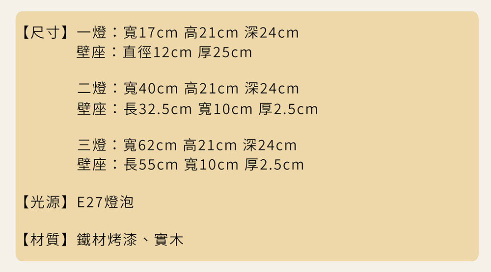 momo購物網站 網路價 2320 元,長63公分、寬17公分,原木、金屬烤漆,E27 X 3、LED燈泡另計... 規格說明