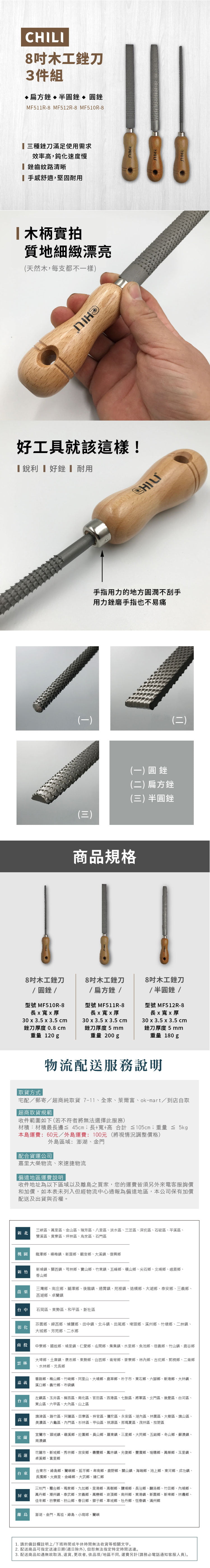 【CHILI】8吋木工銼刀 3件組(圓銼 扁銼 半圓銼 粗齒 挫刀 剉刀 磨棒)