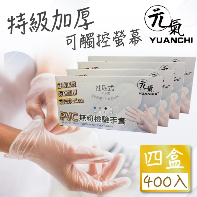 【YUANCHI】PVC無粉檢驗手套(加厚手套/透明手套/無粉/PVC手套/不含易過敏原/可觸螢幕/400支入/四盒)