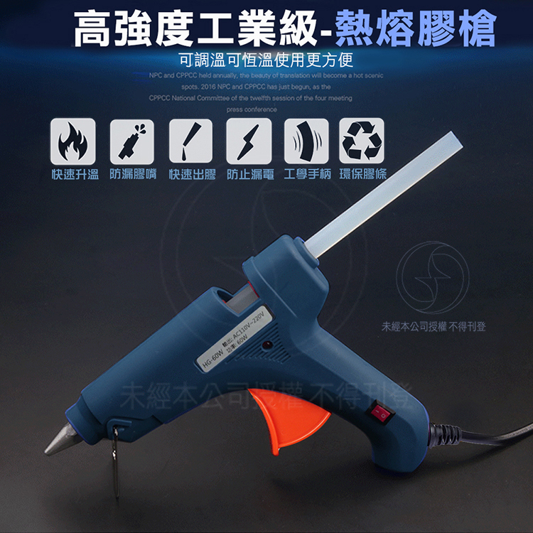 推薦介紹資料※黏著物件的好幫手 功率:60W 頻率:50/60Hz 輸入電壓:100-240V 電源規格:120V 60Hz 60W 額定功率:60W 材質:高級塑膠、無鉛環保急速熔膠 膠條直徑:Ø1.1mm (內附2條) 雙控恆溫、預熱加速、99%銅頭 線長:約 115cm 重量:247G 膠條:11mm(附贈2條) 用途:玩具模型,人造花,金屬,木製品,卡紙,電路板,玻璃製品配 件:1.1mm膠條x2產 地:中國尺 寸:160*190mm 使用方法手柄上有功率控制開關,選好功率,然後將膠條由膠槍尾部插入,送至槍管內,預熱2分鐘,扣動扳機,擠出熔膠,可控制出膠量。 產品應用玩具模型、裝飾品、金屬制品、木製品、卡紙、皮革、汽車地毯、瓷磚、電線、電子線路板等。 注意事項1、本膠槍爲高溫型膠槍,使用直徑爲11mm的膠條;2、工作時熔膠槍噴嘴和熔化的黏膠溫度較高,人體切勿觸摸;3、如連續15分鐘不打膠時,請切斷電源,以免膠條往後熔化造成倒膠而損壞膠槍;4、在不使用時必須放置在支架上。新貨到店 ( •́ὤ•̀) 我從品牌介紹文和優惠推薦文大概了解到這是 黏著物件的好幫手 加熱速度快不滴膠,插電式設計,方便使用,贈2支熱熔膠條。