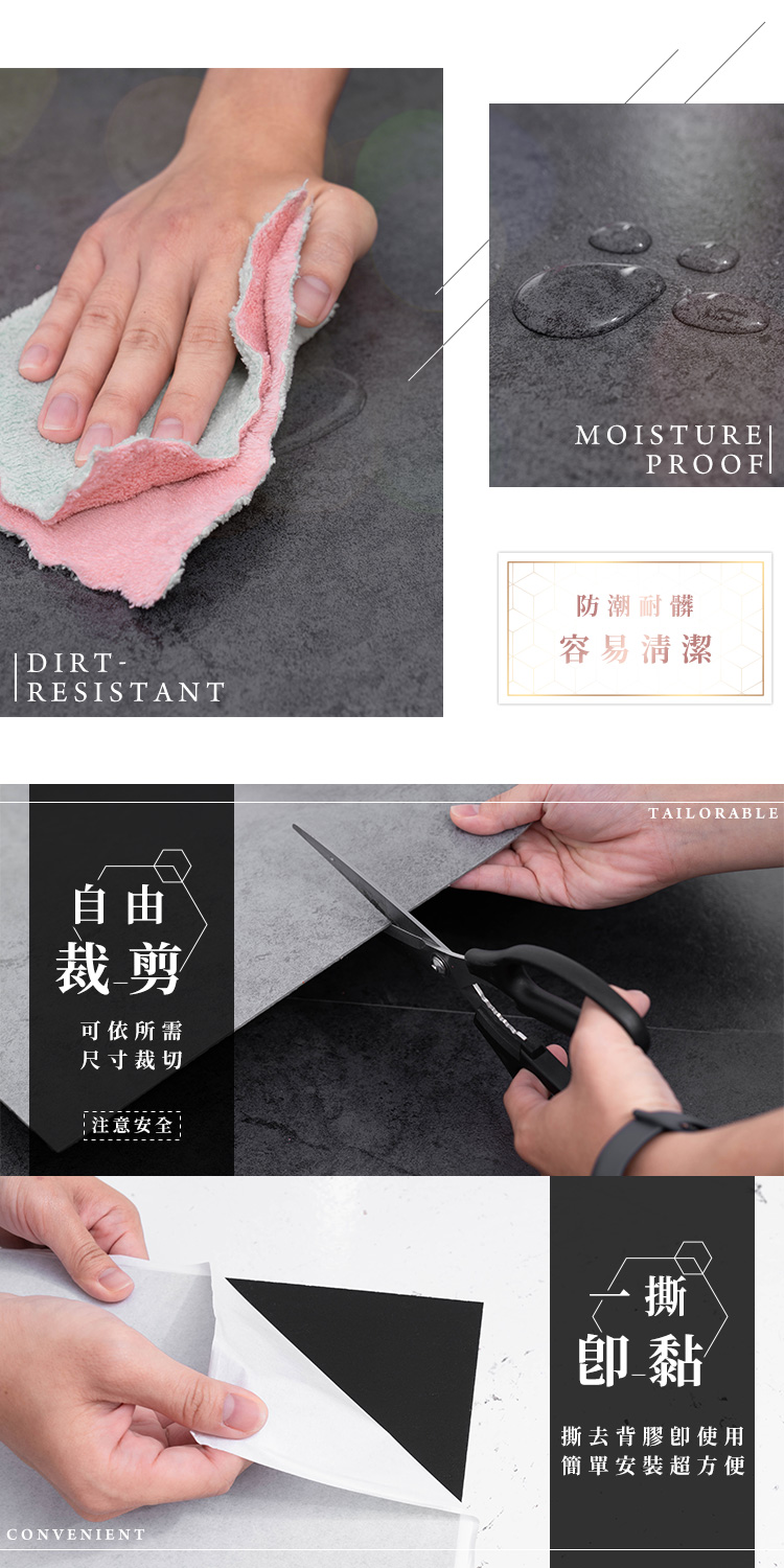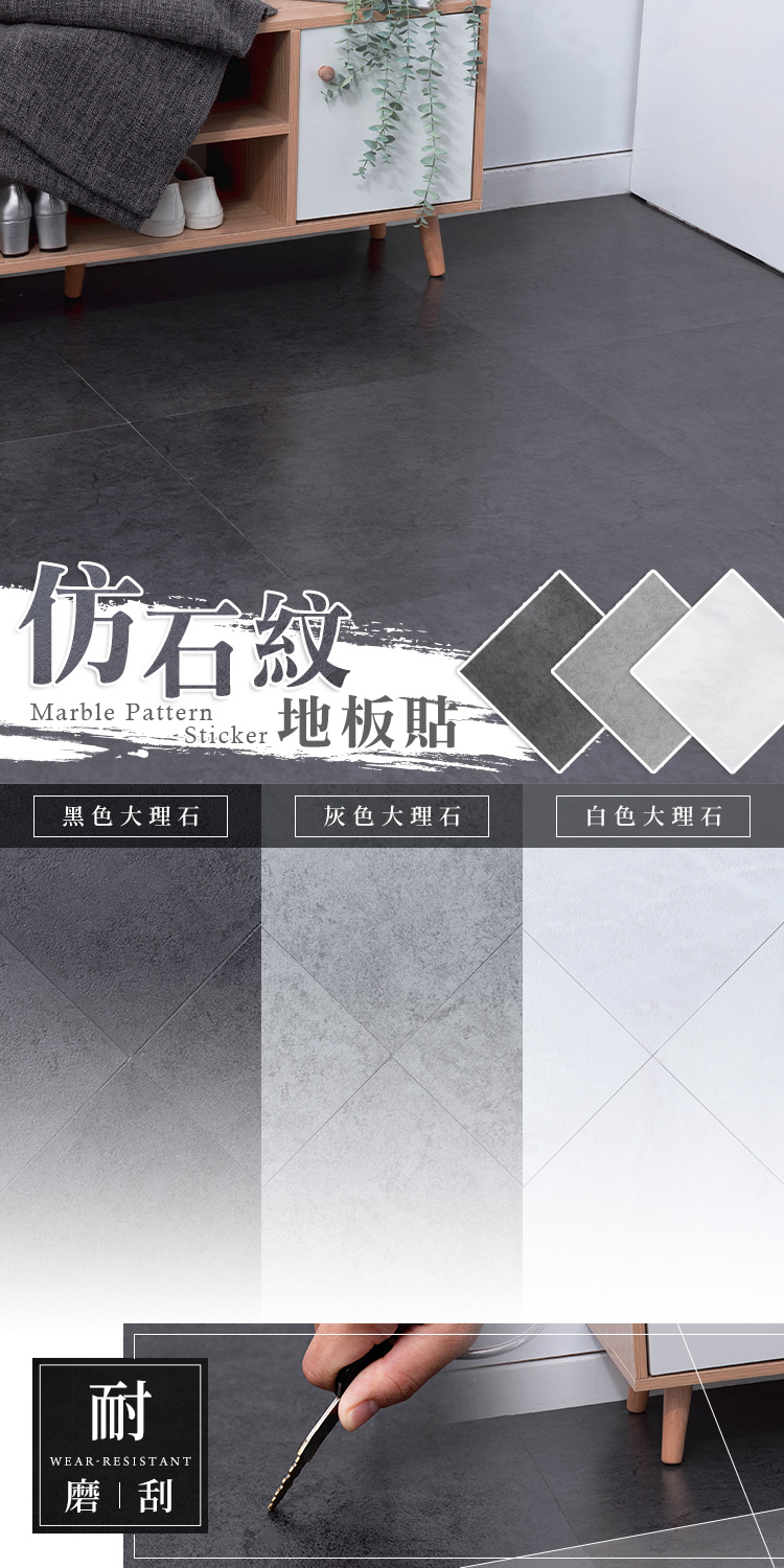 》》【樂嫚妮】DIY自黏式仿石紋地板貼 塑膠地板 防滑耐磨 可自由裁切 27片入/約3坪,看樂嫚妮官網最新價格 商品特色 仿石紋地板貼 一撕即黏 自黏牢固 防水耐磨 適用於平整、乾淨、乾燥的物體面表, 可自行裁切尺寸 多色拼貼方式 可自由發揮 商品規格 產品防水耐高溫,玻璃纖維層降低高溫變型。 款式:仿石紋地板貼 尺寸:約60X60cm(5%) 材質:PVC、PE 重量:約1.03kg (5%) 厚度:約1.2mm (5%) 回收料含量:17.5% 顏色:大理石嘿.大理石白.大理石灰 產地:中國 注意事項 換算坪數僅為參考,實際因地板形狀與消耗原因,購買時須超出房間坪數。 每批貨顏色會有色差問題,請一次性購足所需要的坪數,避免後續因色差問題導致施工困難 沙質、粗糙地面不建議使用,水泥地或原來磁磚地板、木頭地板有碎裂、縫隙等,建議先以市售補土補平再施作新地板 殘膠的狀況,如果不留殘膠,代表地貼不黏,會影響到後續使用年限,另外環境的溫濕度也會影響使用年限 除膠的部分可以購買市面上的除膠劑來輔助,撕下地貼後再用甲苯擦拭,殘膠的部分就能相對易清潔 如果覺得地貼本身背膠不夠黏不易施工,可購買市售白膠補強 DIY組裝商品請戴上工作手套,避免不必要的傷害 安裝前請先確認PVC地板背膠氣味是否能接受,再行安裝 DIY商品組裝前請先核對施工方式 收到商品七天內有問題請洽客服協助處理 鑑賞期非試用期,尚未考慮是否需要退換貨時,請勿拆封使用 退貨商品需返還原狀,若無法原狀返還會酌收整新費 顏色可能因螢幕造成色差、以上規格資料若有任何誤差,以實際商品為準 商品僅配送至收貨地址一樓,如需協助搬運上樓,請自行與司機協調 商品一旦寄出後,若需變更配送地址則會收取轉運費用 公分*公分/32400=幾坪 坪數估算僅為參考,實際因形狀裁減、耗損、失誤等原因,建議請參考實際尺寸並預留多一些作備用。 樂嫚妮新品快報 ( •́ὤ•̀) 本人從品牌官網介紹所瞭解的專櫃品牌特色是自黏簡易DIY 可自由剪裁,耐磨防水易清潔,台灣SGS檢驗 零甲醛PASS 簡單DIY 像貼紙一樣簡單。