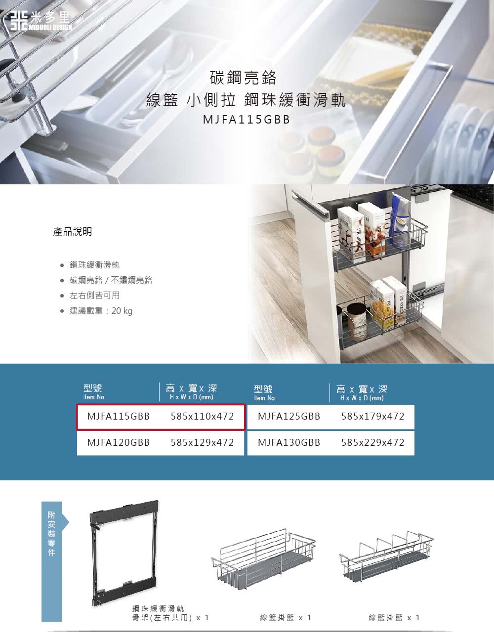 【MIDUOLI 米多里】碳鋼亮鉻 線籃小側拉 鋼珠緩衝滑軌(MJFA115GBB)簡介說明