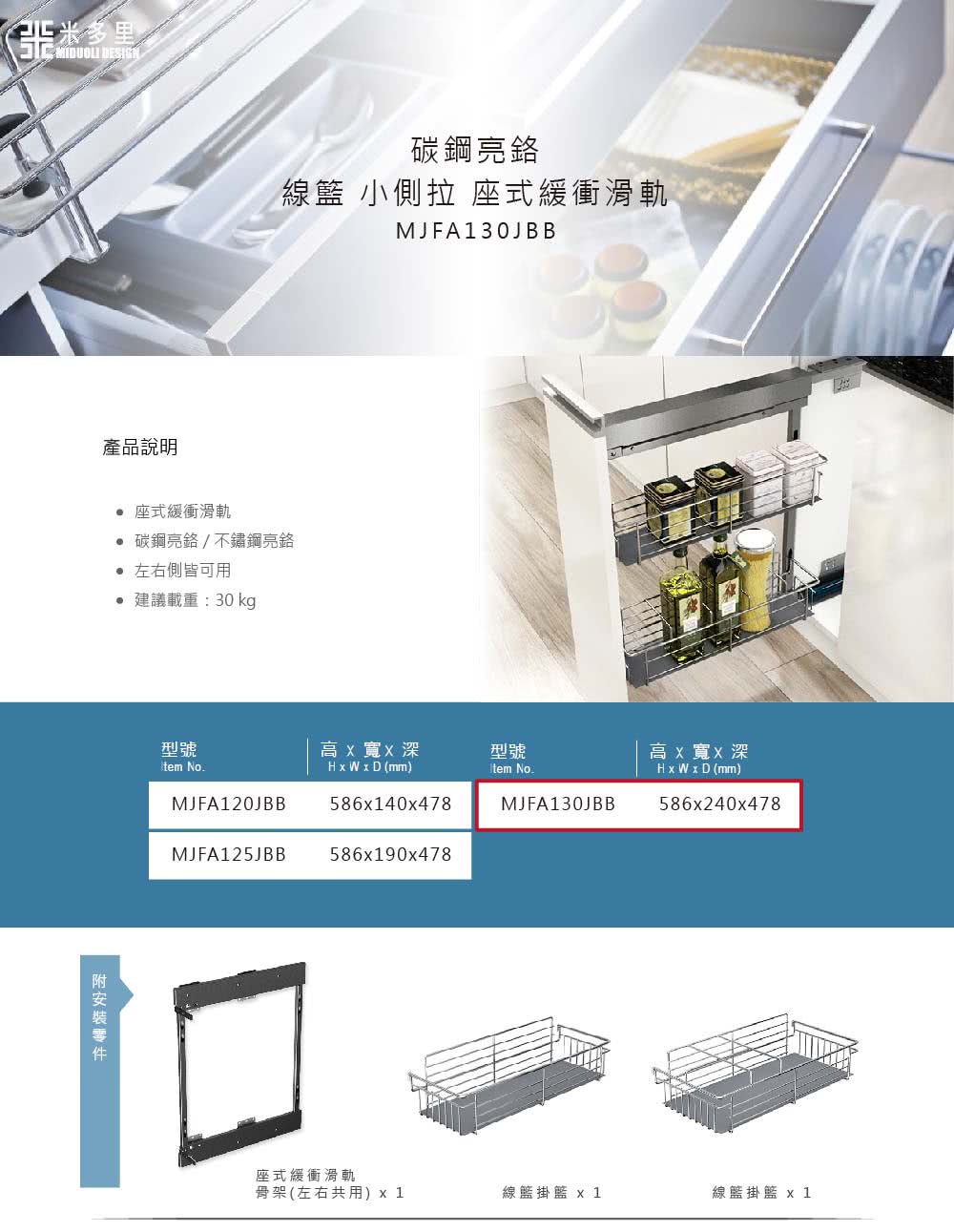 用搜尋找到了價格網廣告特賣文介紹 MIDUOLI 米多里 碳鋼亮鉻 線籃小側拉 座式緩衝滑軌(MJFA130JBB)規格