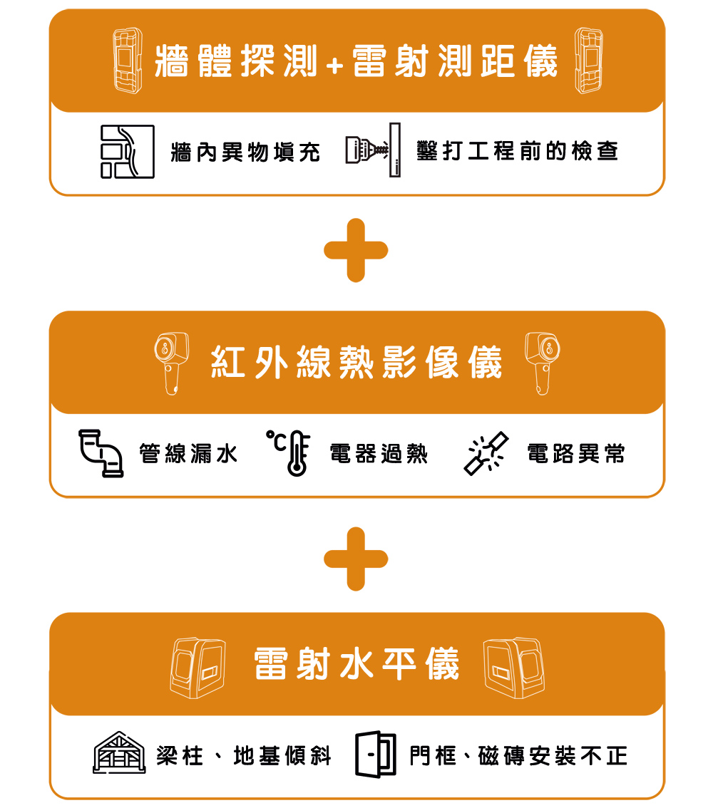 產品介紹 Panrico 驗屋職人專業套組 一套符合業界需求且功能齊全的房屋檢測儀器 驗屋不求人,居家大小事交給百利世! 檢驗更方便,掌握數據好協商 您還在為會買到有問題的房屋,傷透腦筋? 與其買屋後還要花大筆金錢整修,不如事先做檢查,讓自己更放心更省荷包。 許許多多的屋況,光憑目視,觸摸,人員口述,都無法完整正確的說明清楚, 這時可透過專業儀器的數據,讓所有問題狀況, 一覽無遺,不論您是水電師傅、房屋仲介、營造商,有了這一箱,以數據來溝通,減少紛爭,讓買屋者更安心。